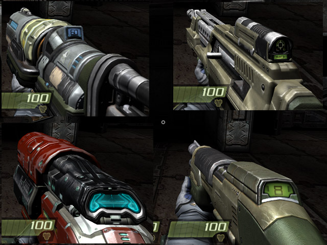 A comparison shot of Hyperblaster, Machinegun, Railgun and Shotgun, top image shows Quake2 weapons and bottom shows Quake4 weapons... Alltough Raven did an admirable job on the weapons models, its clearly not the same weapons, something id expect from a sequel, unfortunatley this is something that can be seen trough the entire Quake4 game not only weapons but enemies alike... In Quake2 the hyperblaster has a curved banana magazine, but in Quake4 it has an ammo cylinder ontop instead... In Quake2 the machinegun has a straight magazine stick in the pistolgrip while in Quake4 it has the magazine infront of the pistolgrip... In Quake2 the railgun is configured for the shoulder while in Quake4 its configured to be fired from the hip... In Quake2 the shotgun has a drum magazine while in Quake4 we first have the shotgun being tube loaded while later uppgrade adds a straight stick magazine... Alltough just minor changes that probably wouldnt bother anyone who has never played Quake2, these minor changes however adds up in the long run wich drasticlly changes the entire game completly, so from my viewpoint its hard to call Quake4 for an actual sequel to Quake2 since the game differs so much not just in apperance but in gameplay aswell... I do belive in improving a game trough sequels not drasticlly altering the game, as it stands Quake4 is more similar to Doom3 than it is a sequel to Quake2... Quake2  Quake4  |